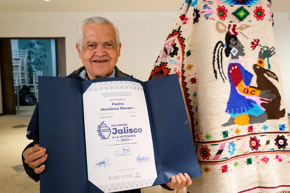 Armando Esquivel.- Con la pieza “Gabán tradicional de Jocotepec”, el maestro obrajero Pedro Mendoza Navarro, fue el ganador del Galardón Jalisco a la Artesanía 2022, en la categoría textil, siendo galardonado por el Gobernador de Jalisco, Enrique Alfaro Rámirez, el 11 de noviembre.
