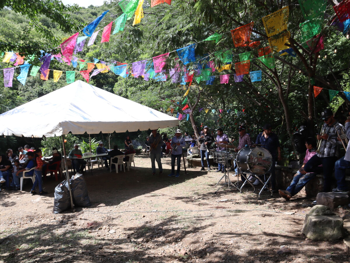 Comida tras la misa y agrupación que amenizó el festejo, que se realizó frente a la capillita de San Miguel Arcángel. Foto: Sofía Medeles.