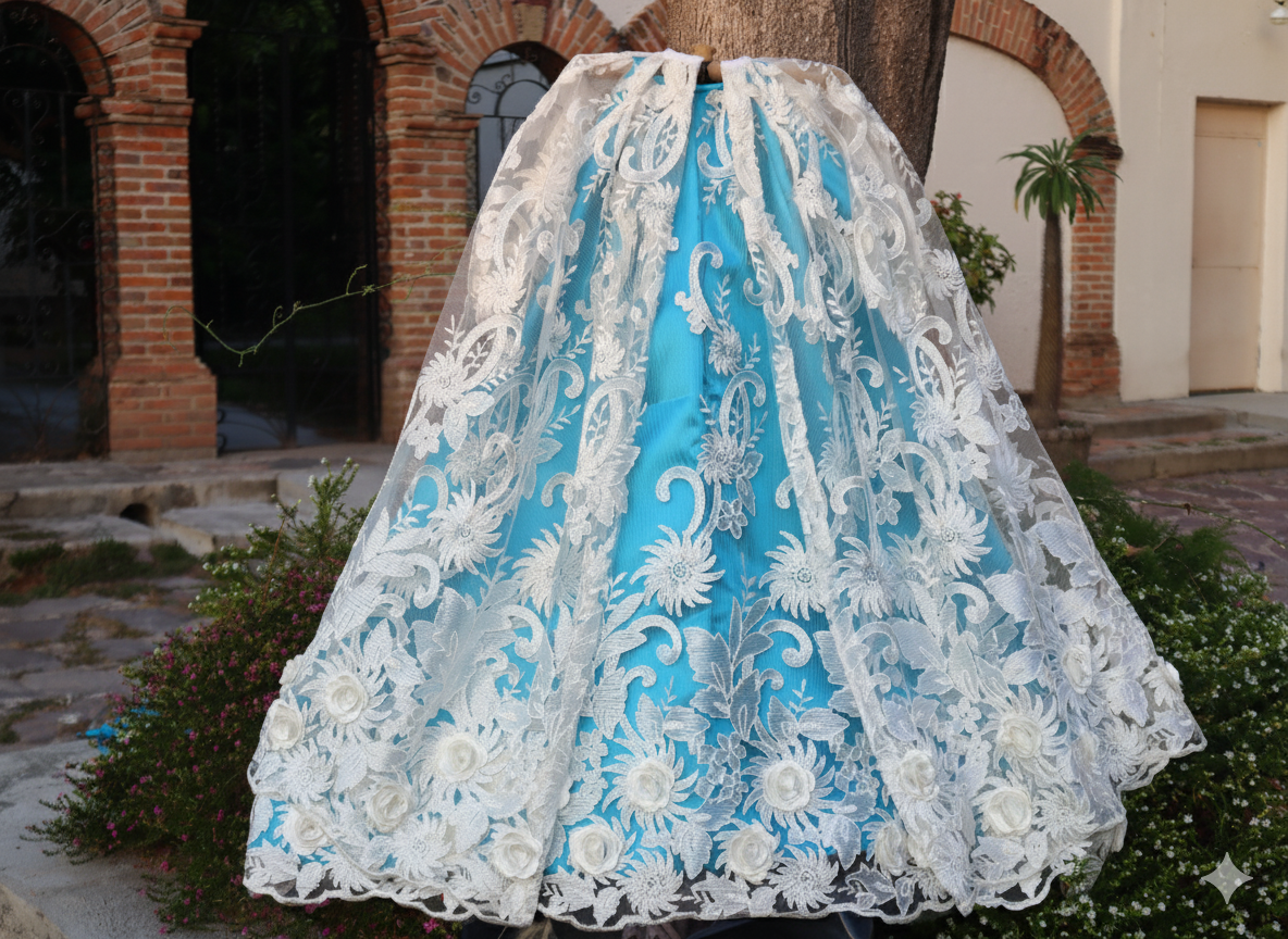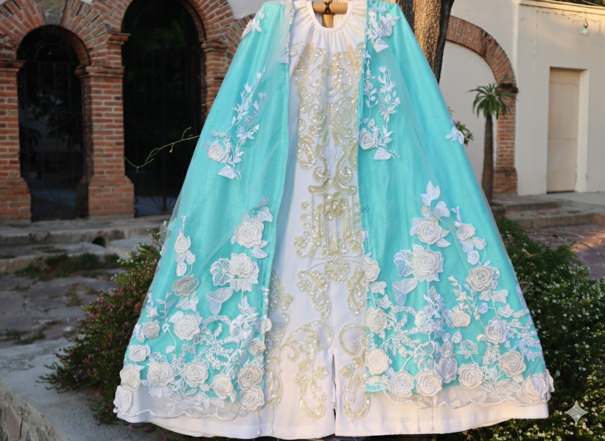 Otro de los vestidos con los colores más representativos de la Virgen del Rosario: blanco y azul. Foto: Sofía Medeles.