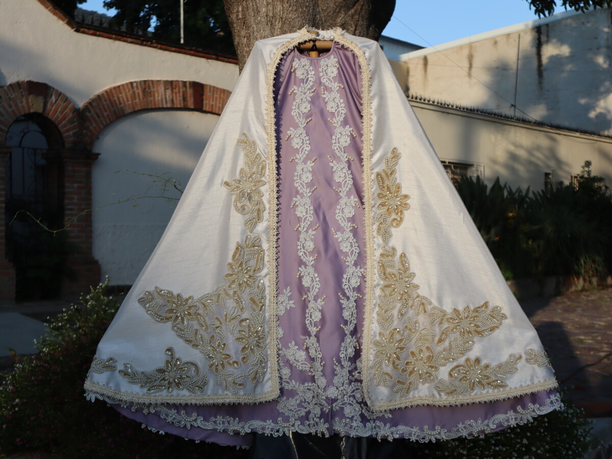 Vestido que la Virgen del Rosario usó el año pasado. Esta tela cuena con la aplicación incluida, por lo que fue más breve su elaboración. Foto: Sofía Medeles.