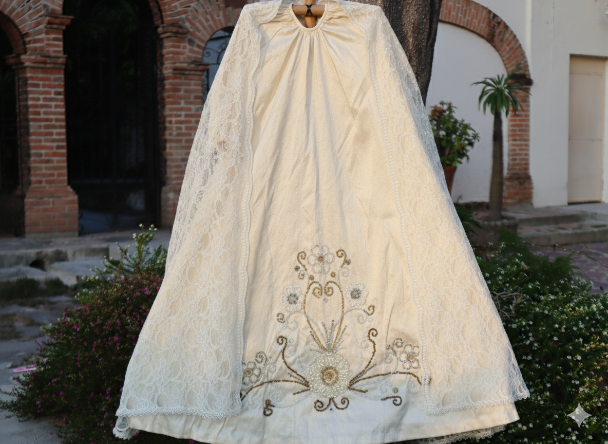 Vestido color crema con capa a juego. Cuenta con bordados en la zona centro. Foto: Sofía Medeles.