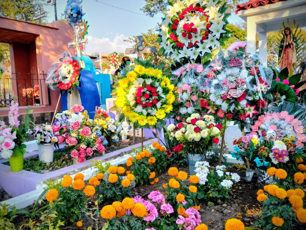 Pobladores llenaron el panteón de colores con las múltiples flores, en la plaza se instalaron adornos alusivos al Día de Muertos