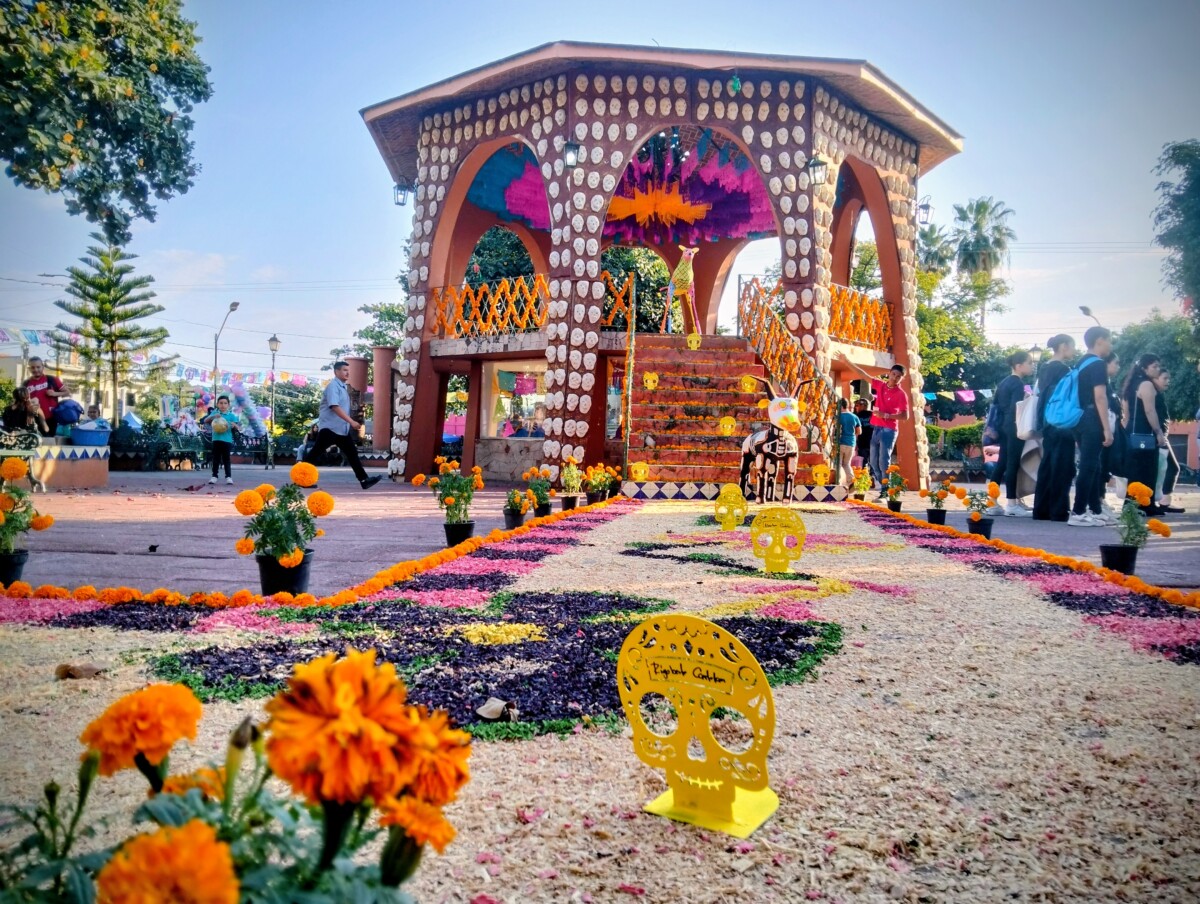 En la calle Del Cardenal, pero del lado de la plaza, se montaron un par de alebrijes, altares y algunas calaveras. El quiosco también fue decorado con flores y con un tapete de aserrín. Por la noche se realizaron presentaciones en un escenario montado sobre la plaza principal.